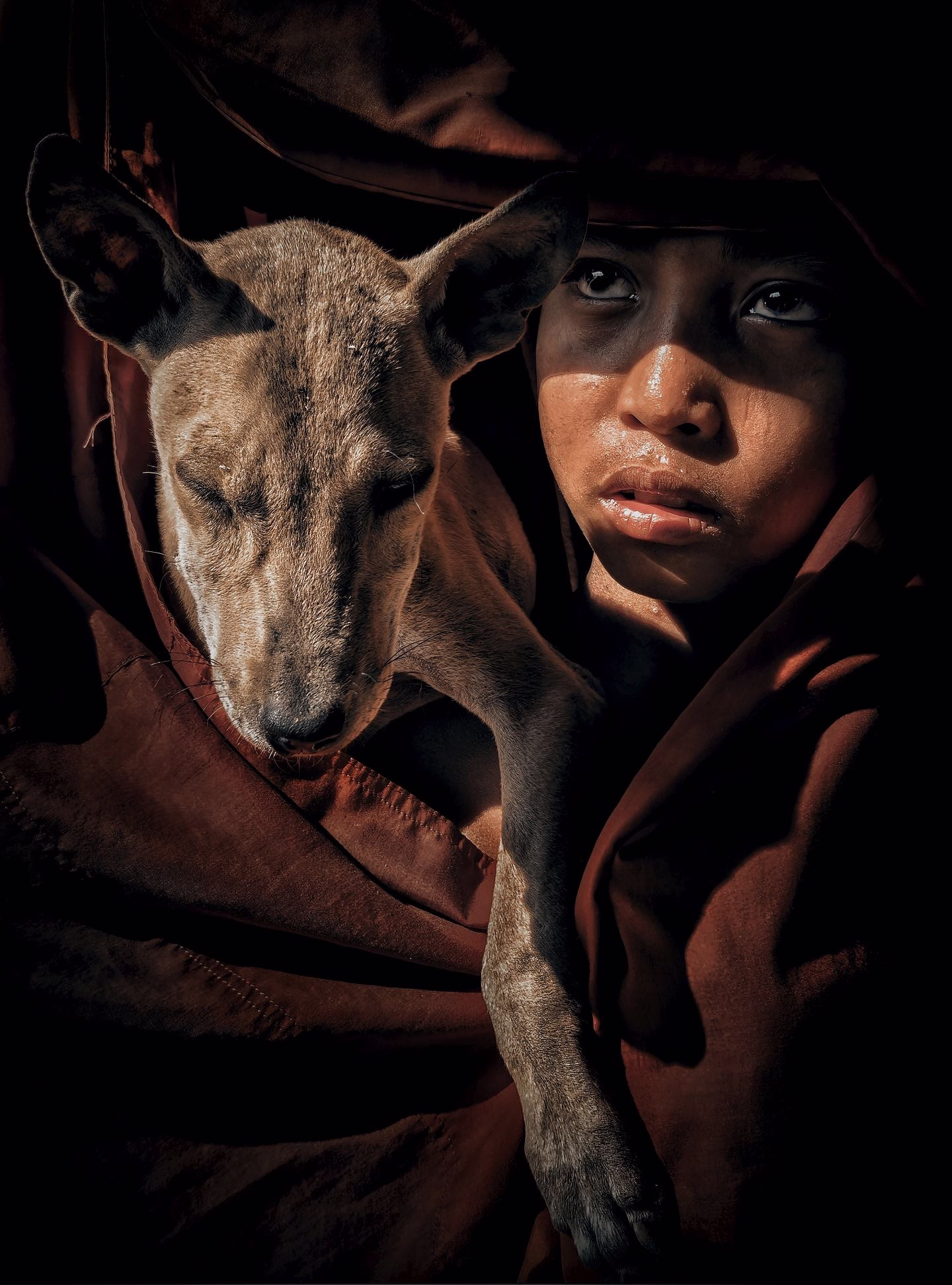 Clad in a radiant crimson robe, the young monk held his faithful dog close. Sunlight caressed their faces, illuminating a profound sense of warmth and serenity. Though from different worlds, they shared a silent bond woven from trust and affection. In that fleeting moment, neither was alone—the boy found solace, and the dog found its sanctuary.